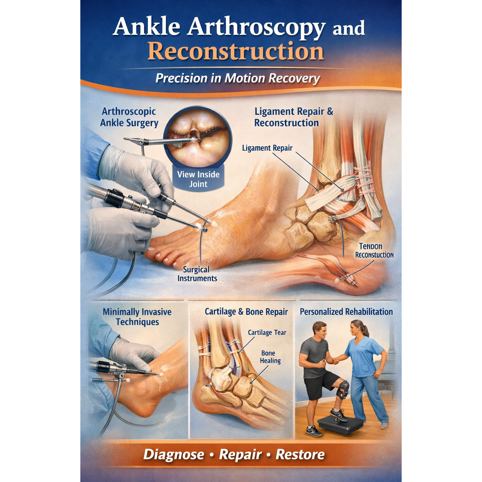 Ankle arthroscopy uses tiny instruments to repair tissue with minimal invasion, ensuring faster recovery and less discomfort. When reconstruction is needed, the surgeon rebuilds the damaged ligaments to stabilize the joint and restore normal function.